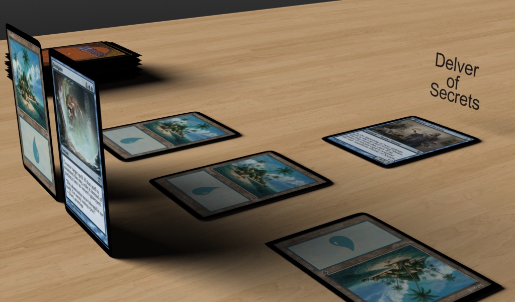 Below is a little 3D render I did in my spare time over the weekend. I was just imagining what Magic Online could really look like today if they updated their graphics to 2012 3D standards…. The standing up cards were meant to represent your hand, and I thought users might need bigger text to be able to read the names of cards on the battlefield.