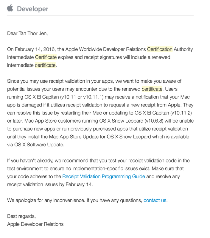 If you are a Mac user, some of you might have problems starting the app in the last day or so. This is because of the expiry of the Apple security intermediate certificates.